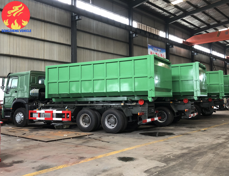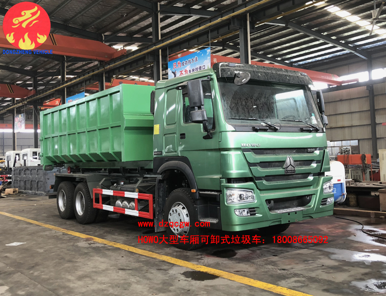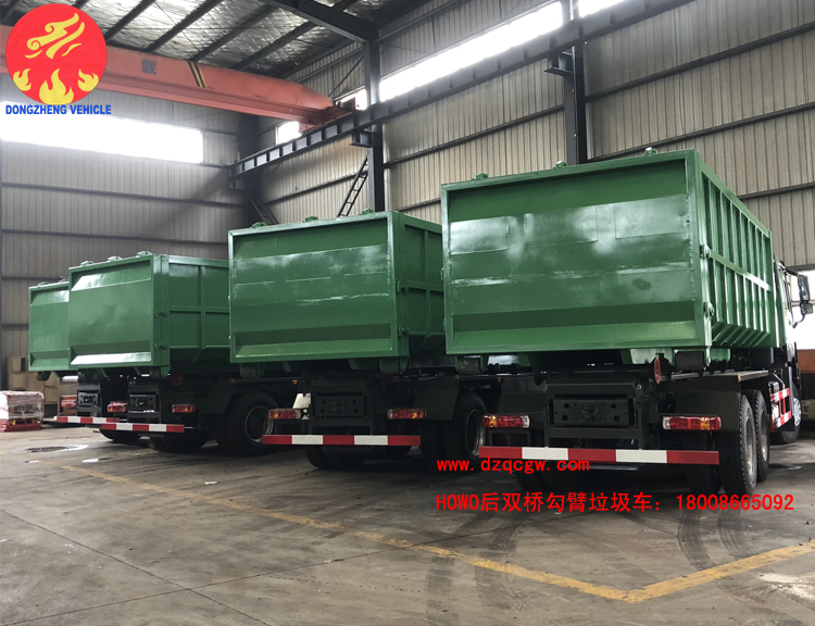 重汽豪沃后雙橋大型勾臂式垃圾車已下線,準備發(fā)往港口。